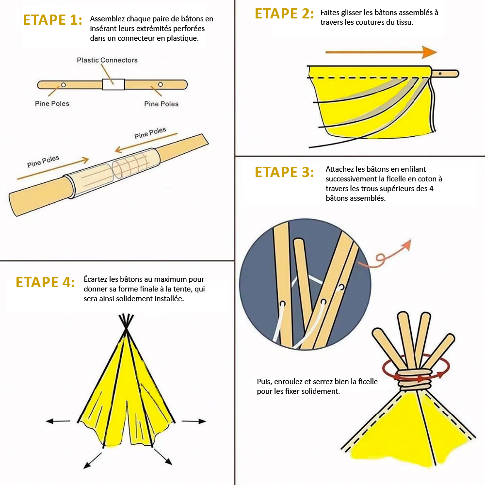 • Montage Simple et Rapide : Le tipi est facile à assembler grâce à des instructions claires. Une fois monté, il peut être replié et rangé facilement, ce qui le rend pratique pour les petits espaces.